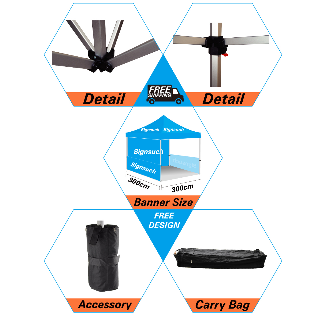Standard Price Include : Hexagonal Aluminum Frame and 600D Oxford Fabric Custom Canopy with Printing Selected, 600D Oxford Fabric Custom Wall with Printing Selected, Carry bag & Stakes & Sand bag Selected Table Cloth
