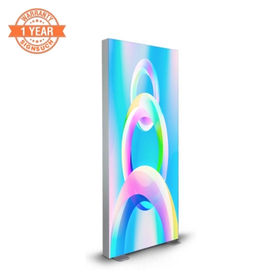 Both front and back of the portable SEG fabric backlit wall have a press-fit polyester panel printed with custom graphics.